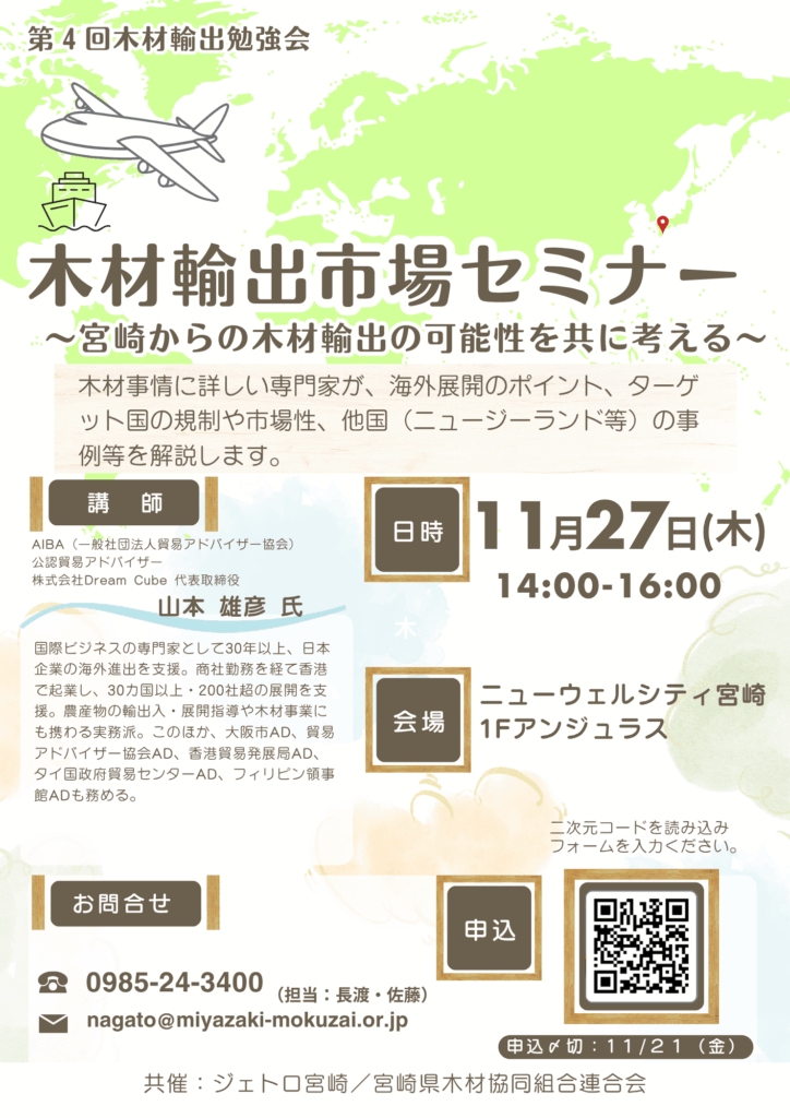 第4回木材輸出に関する勉強会を開催いたします 11月27日(木)に、 「木材輸出市場セミナー ~宮崎からの木材輸出の可能性を共に考える~」 を開催いたします。 海外展開を検討中の方や、最新の動向を知りたい方は、ぜひご参加ください。 詳細は下記のチラシをご覧ください。 お申し込みはページ下部の申込フォームからどうぞ。 第4回木材輸出に関する勉強会:申込フォーム